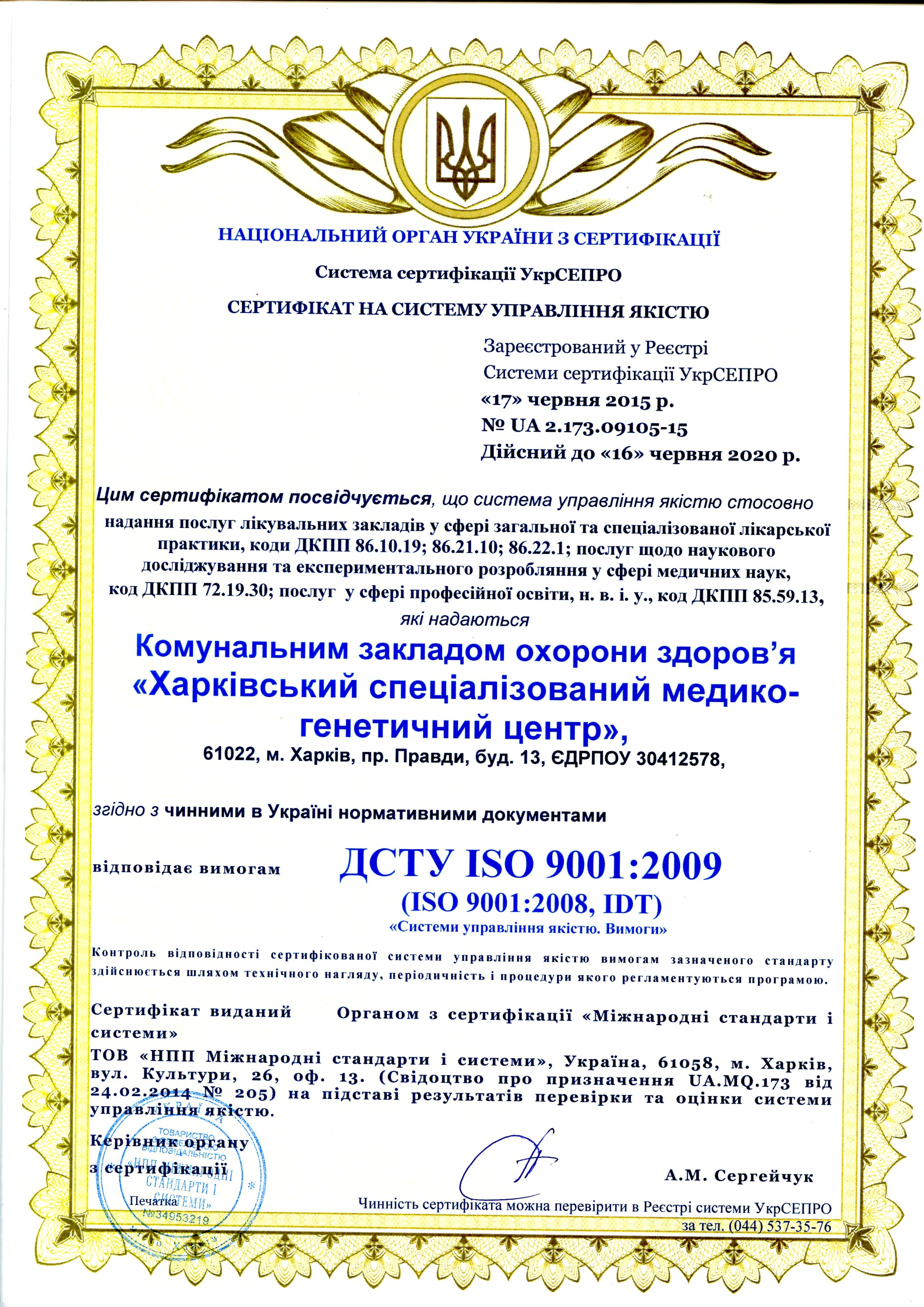 Наш центр соответствует качеству предоставления медицинских услуг, и соответствует ДСТУ ISO9001:2009